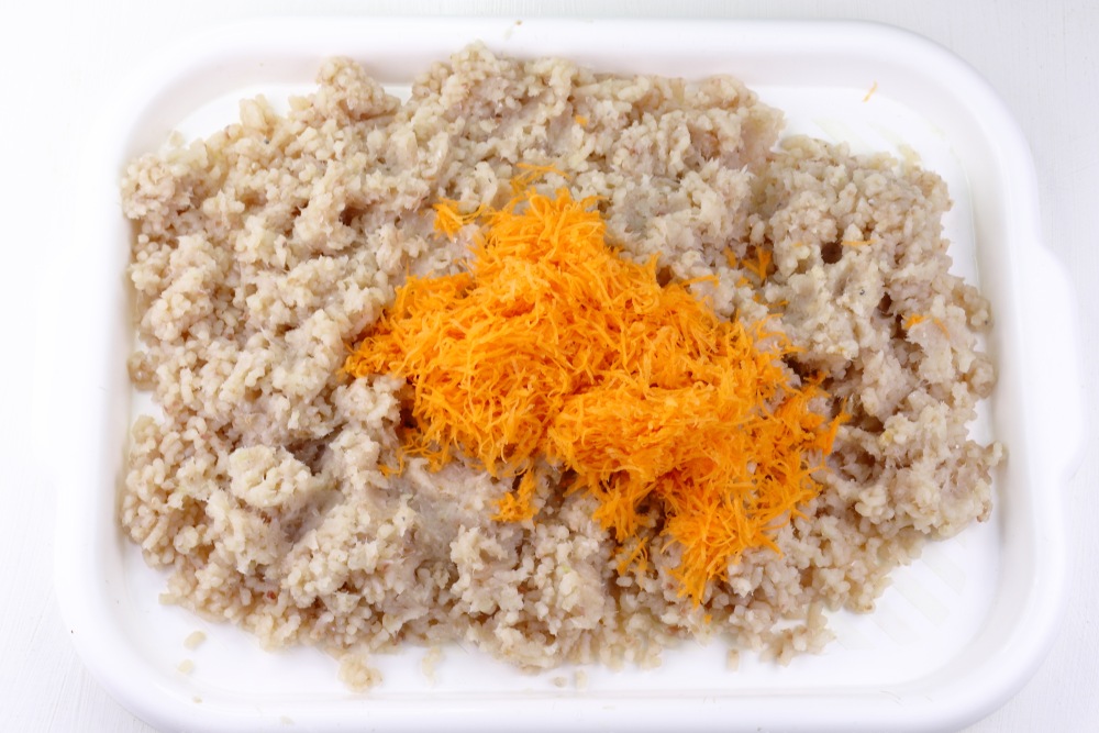 Рыбный фарш переместить в удобную посуду. Добавить тертую морковь. Хорошо перемешать до равномерного распределения моркови по всему фаршу.