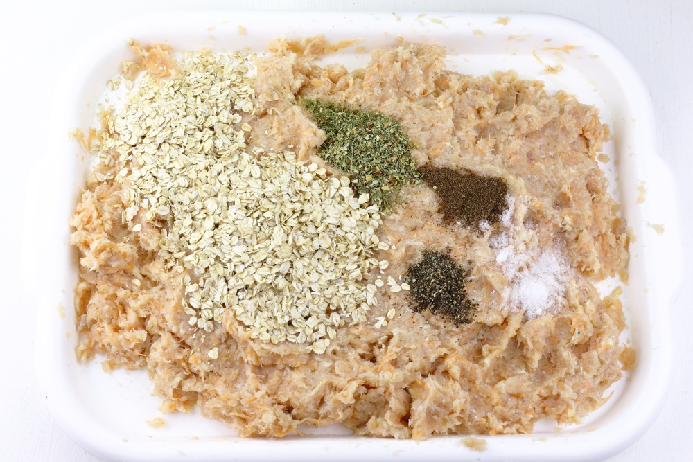 Всыпать соль, молотый черный перец и душистый, итальянские травы, овсяные хлопья. Специи можно подобрать по своему вкусу.