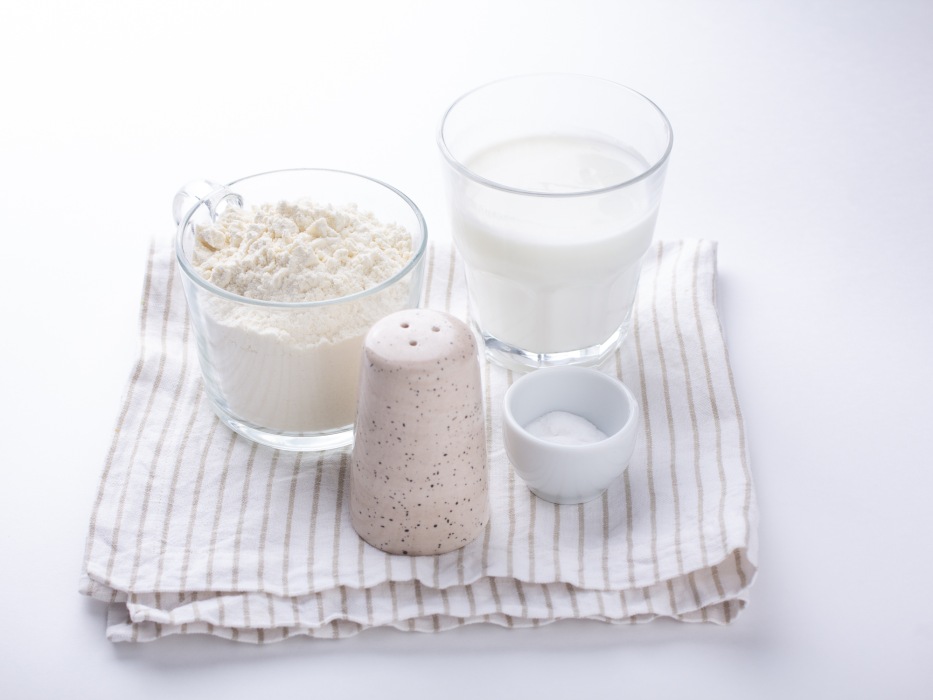 Подготовить все ингредиенты для приготовления простых замороженных лепешек. Кефир заранее достать из холодильника. Он должен быть комнатной температуры. Отмерить нужное количество муки.