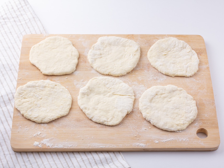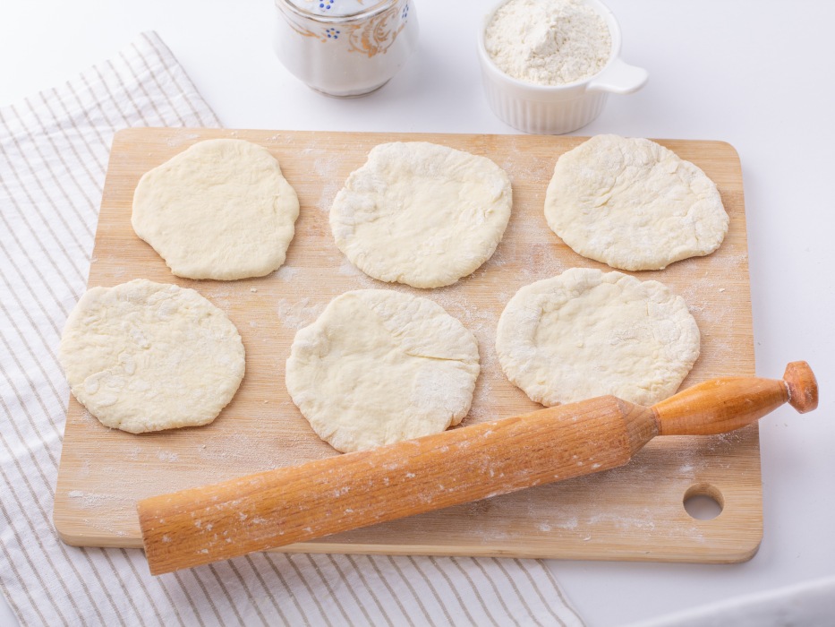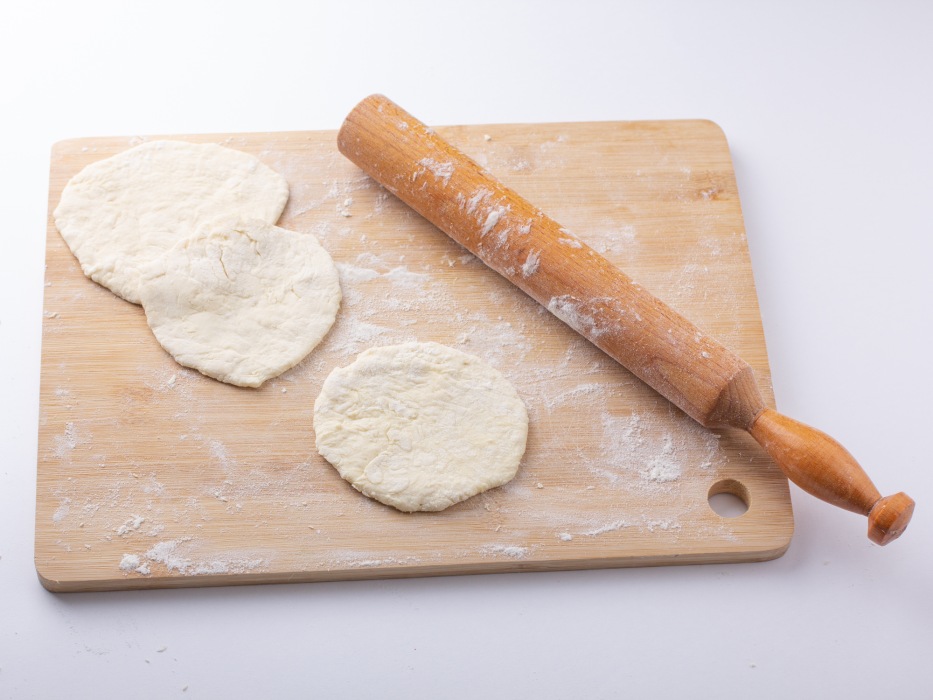 Сформировать из шариков круглые заготовки нужного диаметра, после чего раскатать каждую скалкой до равномерной толщины в 1–3 сантиметра.