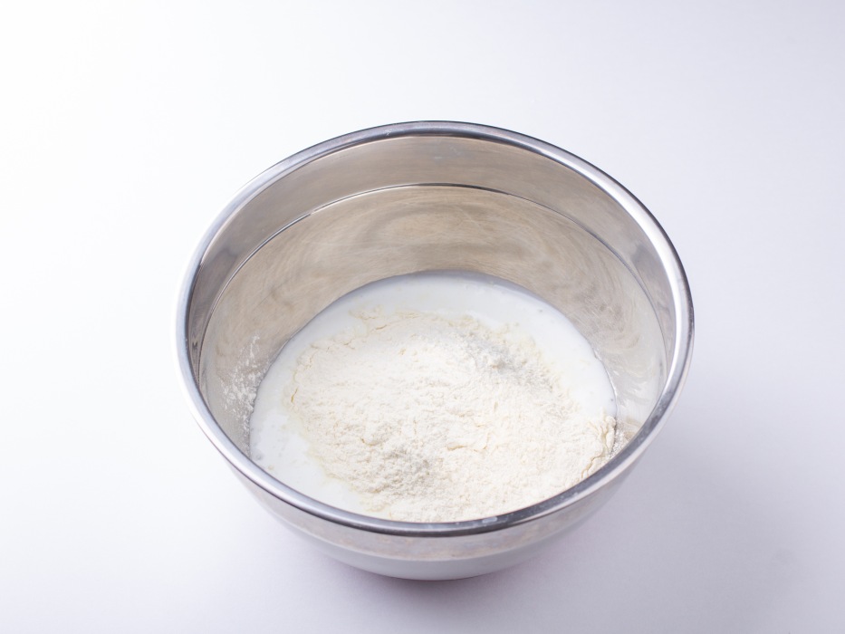 Постепенно добавить просеянную муку, равномерно распределяя её по всей поверхности жидкости для облегчения последующего вымешивания.