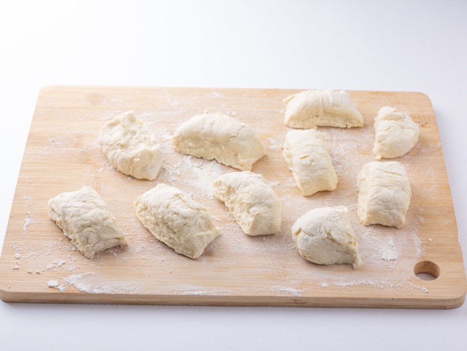 Скатать колбаску и разделит тесто на 6-7 равных частей.