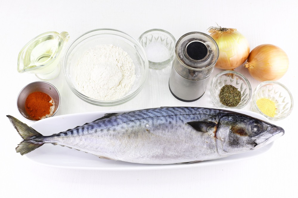 Подготовить необходимые ингредиенты для рецепта жареной скумбрии с луком на сковороде.