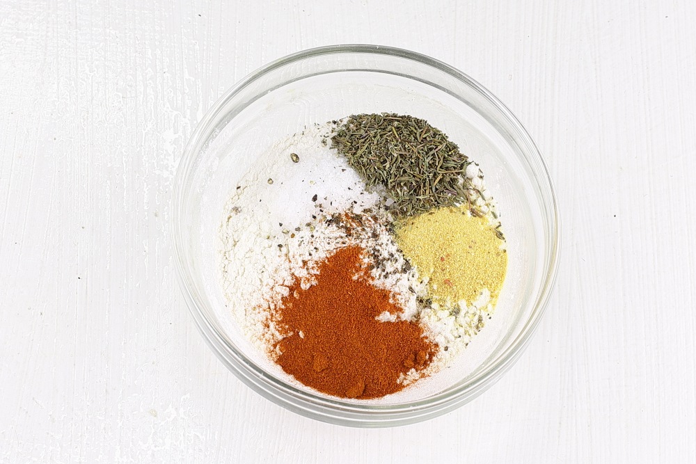 К просеянной муке добавить соль, молотый черный перец, паприку, цедру апельсина, тимьян. Перемешать.