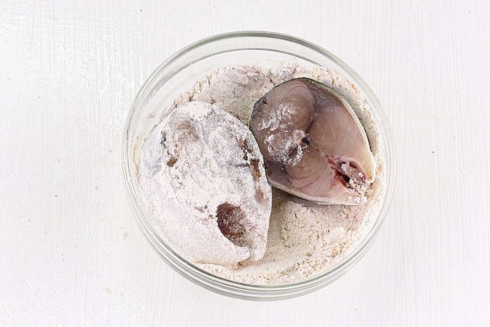 Аккуратно обвалять кусочки скумбрии в панировке. Погрузить рыбу в муку со специями так, чтобы каждый кусочек был полностью покрыт со всех сторон. Нажать на рыбу слегка, чтобы панировка прочно прилипла к мясу. Это обеспечит хороший слой, который сделает корочку хрустящей при жарке. Встряхнуть лишнюю муку. Для этого можно слегка постучать обвалянным кусочком рыбы о край тарелки или разделочную доску.