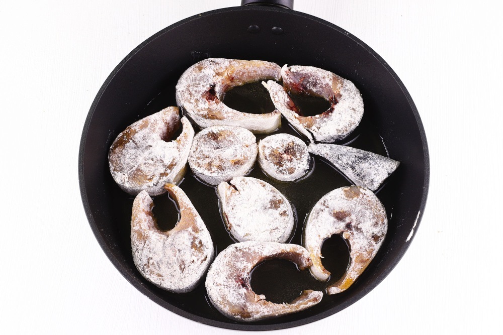 Чтобы проверить, достаточно ли разогрелось масло, можно добавить в него щепотку муки – если мука сразу начинает пузыриться и шипеть, значит, масло готово. Лучше всего использовать сковороду с толстым дном, например, чугунную или с антипригарным покрытием. Это поможет рыбе жариться равномерно и не пригорать.
