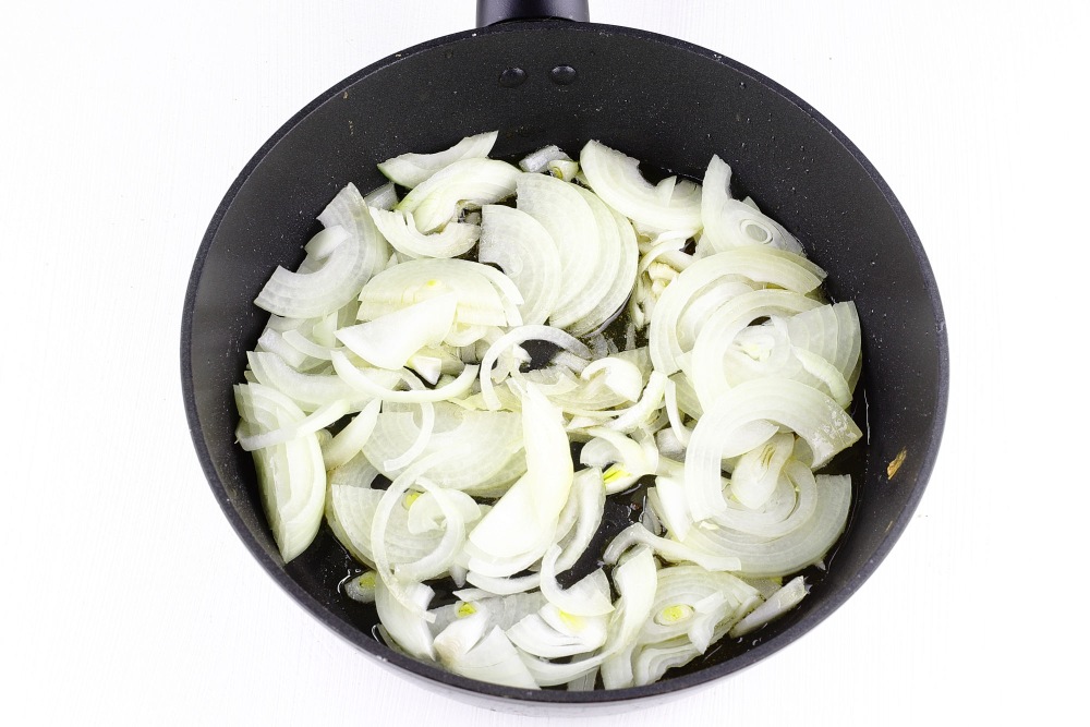 Лук нарезать тонкими полукольцами. Отправить в сковороду с разогретым маслом.