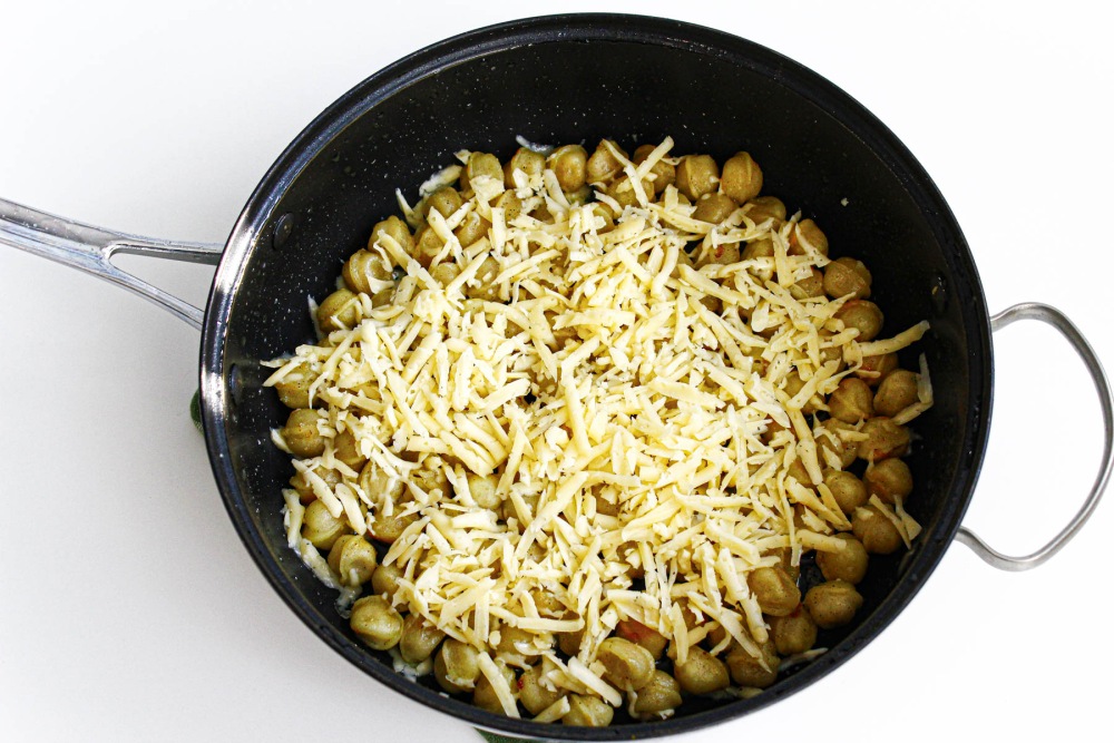Посыпать пельмени натёртым сыром, распределить его равномерно по всей сковороде.