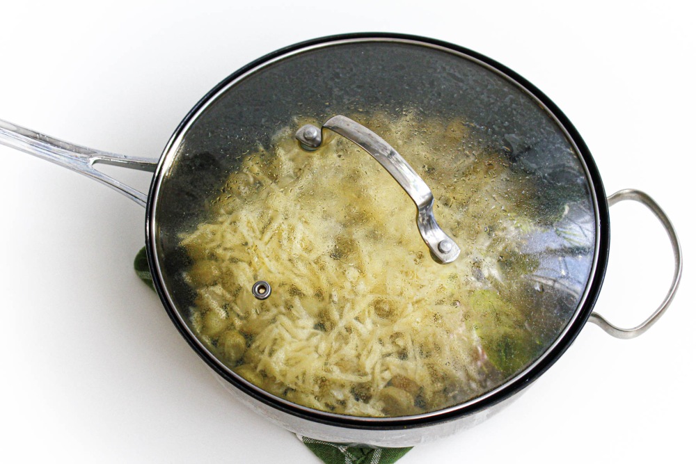 Оставить под крышкой (огонь/мощность минимальный) на 1–2 минуты, чтобы сыр полностью расплавился.
