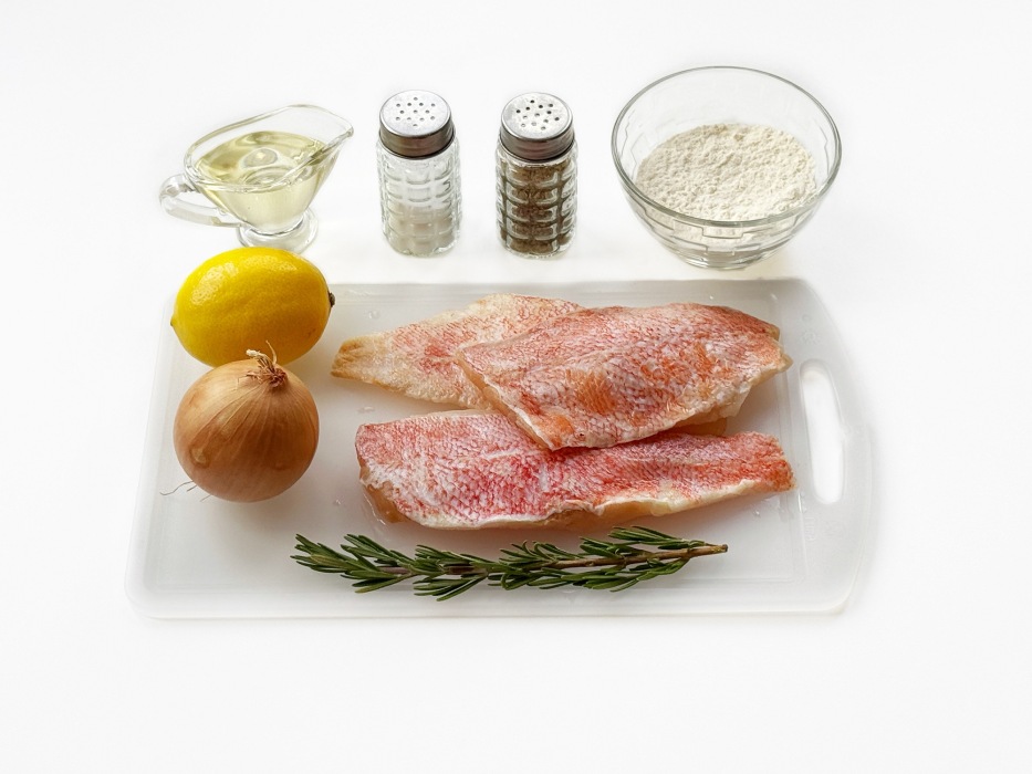 Подготовить ингредиенты для приготовления жареного морского окуня с луком на сковороде.