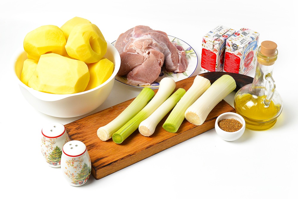 Подготовить ингредиенты: свинину, картофель, лук-порей, сливки, масло для жарки, соль и приправу.