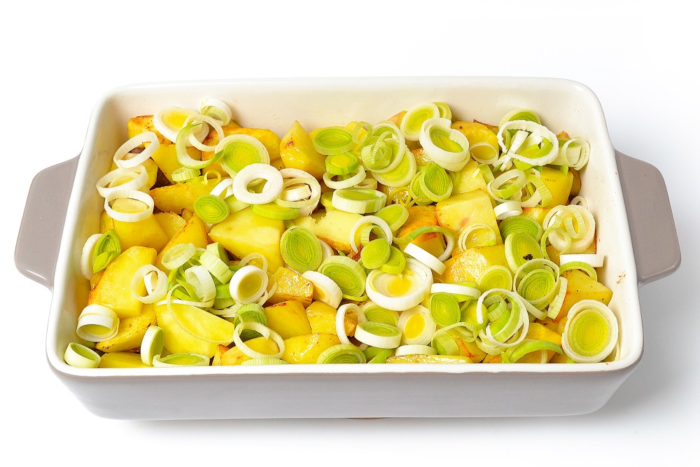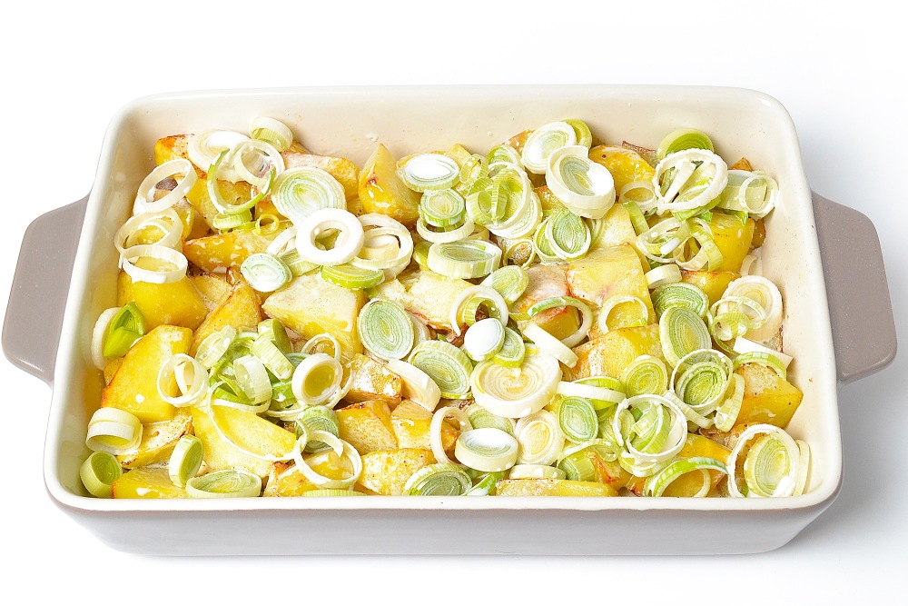 Пока жарится картофель, нарезать лук-порей кольцами.