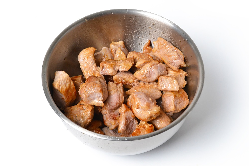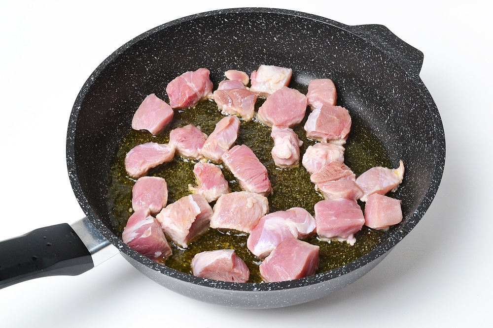 Сковороду разогреть, налив в нее растительное масло. В 1 слой выложить часть свинины. Если готовите 1 кг мяса, разделите на 2 партии. Так оно обжарится равномерно и сохранит весь сок внутри.