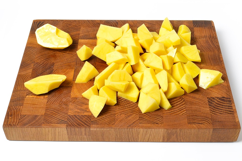 Картофель нарезать крупными произвольными кусочками размером чуть больше мяса.