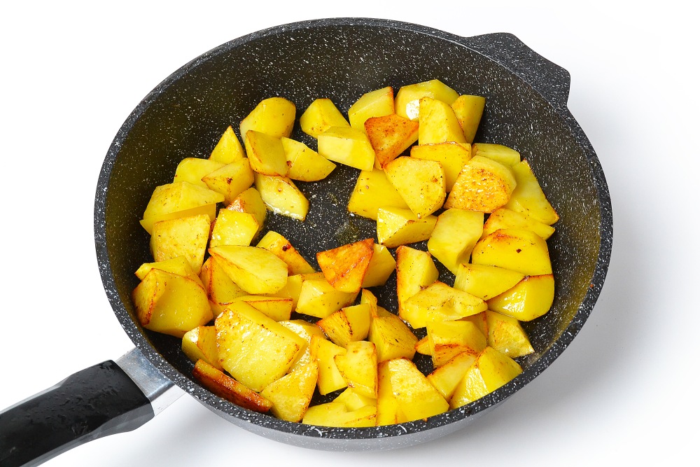Совет: чтобы картофель меньше «стрелял», можно предварительно обсушить его бумажными полотенцами.