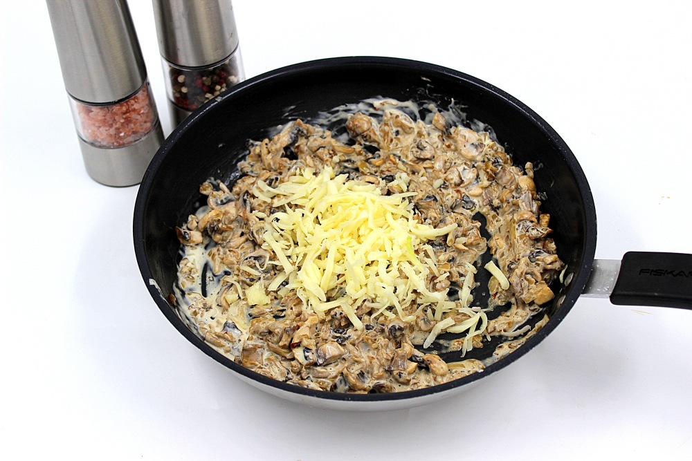 В остывшую грибную начинку добавить тертый сыр. Перемешать и начинка готова.