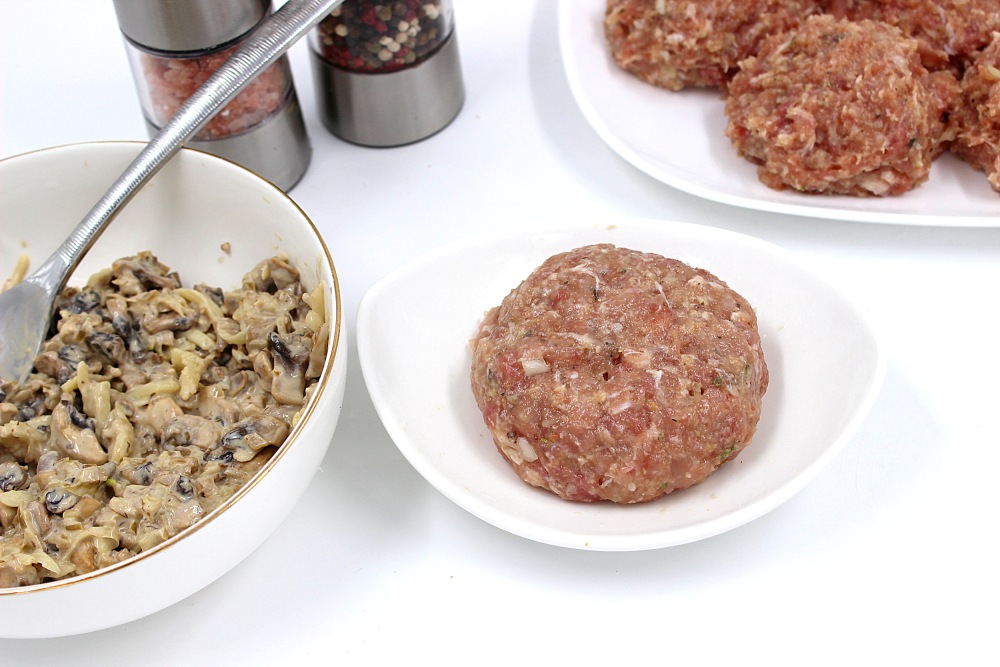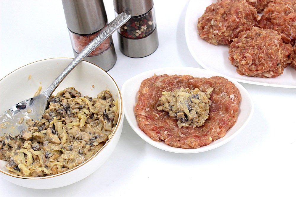 Фарш расплющить на влажной ладони и выложить примерно столовую ложку грибного жульена.