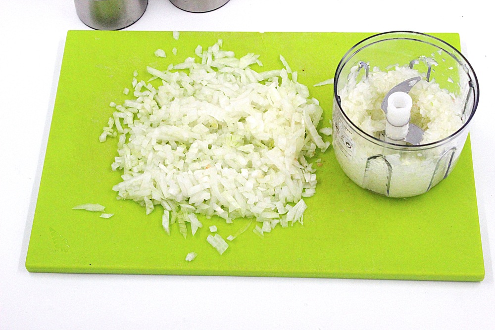Измельчить обе луковицы. Одна в блендере, вместе с чесноком - пойдет в фарш. Вторую для начинки мелко нарезать с помощью терки бернер.
