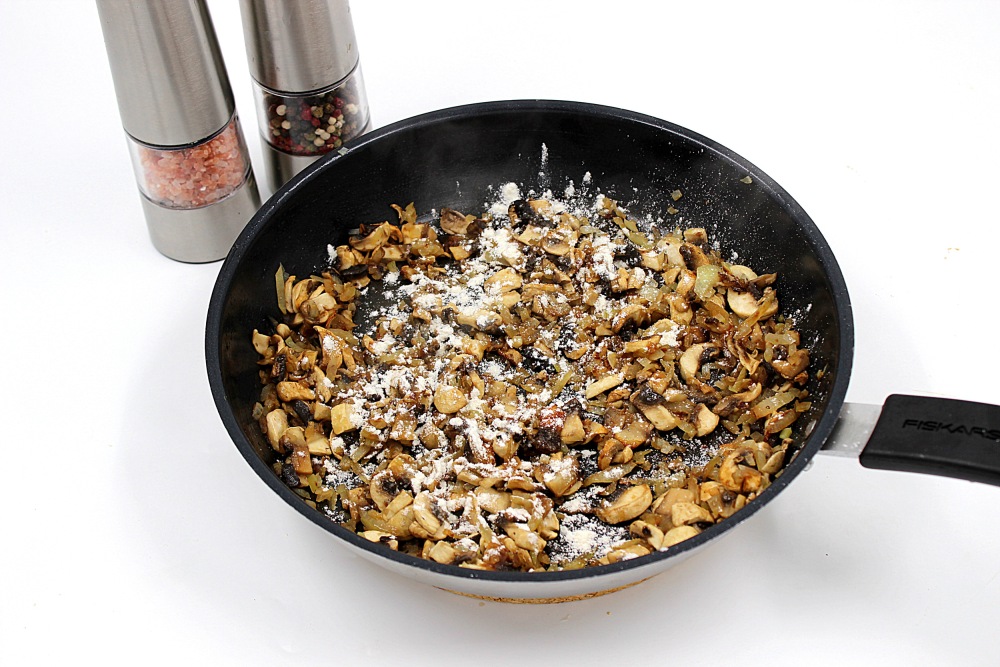 Всё перемешать и жарить до лёгкой румяности грибов, около 3-4 минут. После по поверхности припылить мукой.
