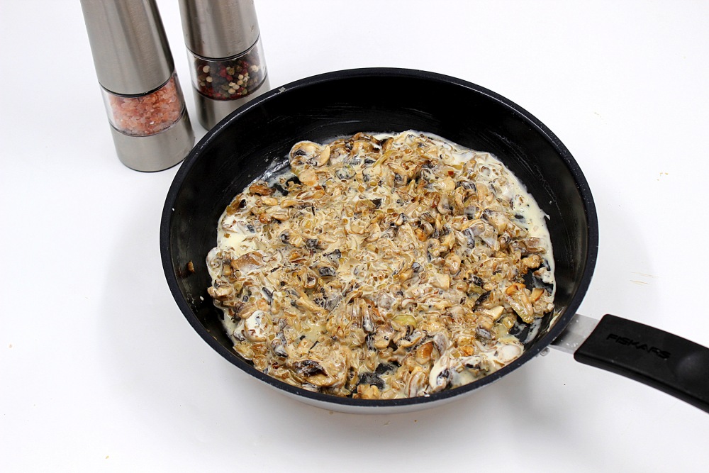 Перемешать, влить сливки, чуть посолить-поперчить, довести до кипения и отставить остывать.